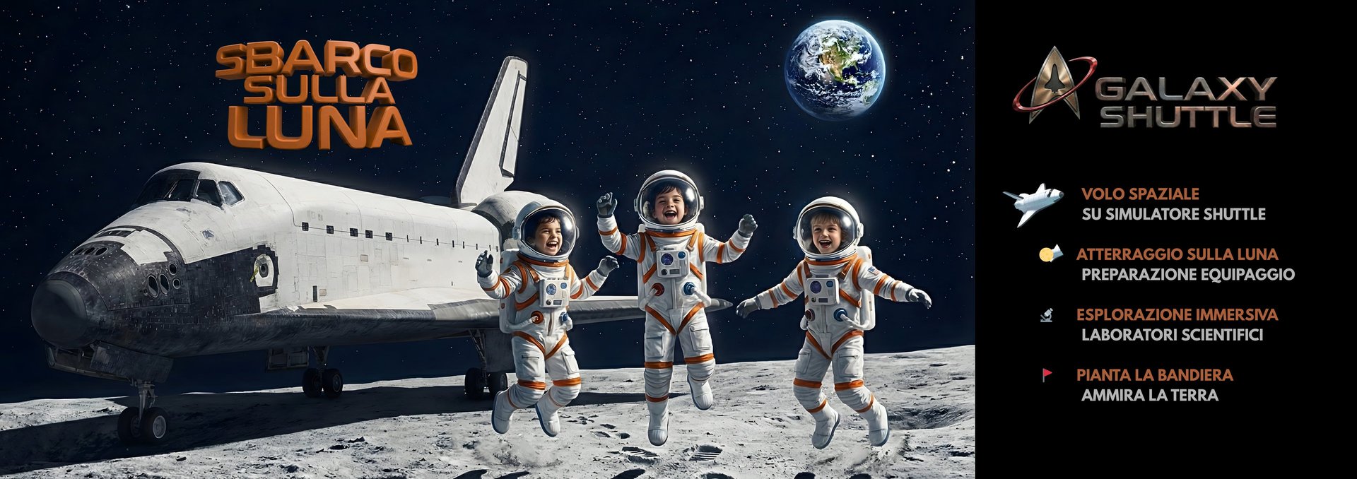 L’ esplorazione spaziale è tornata protagonista. "SBARCO SULLA LUNA" è il format di edutainment tecnologico che permette al grande pubblico di vivere oggi la prossima grande missione dell' umanità. A bordo del GALAXY SHUTTLE, un reale simulatore BOEING 737/800 configurato per il volo lunare, i visitatori non sono spettatori, ma parte dell' equipaggio. Il percorso è un' avventura sequenziale: dal decollo adrenalinico nel simulatore professionale, all' atterraggio alla Base e la trasformazione in Cadetti. 4 scenari iper-realistici con laboratori interattivi. Il gran finale è pura emozione: piantare la bandiera con la vista mozzafiato della Terra. Un evento spettacolare, educativo e indimenticabile.