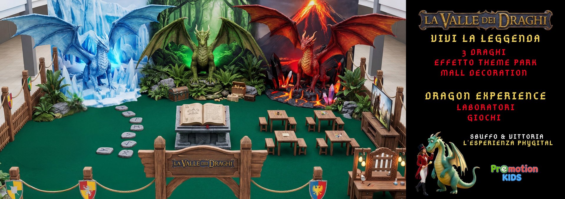 Trasformiamo il cuore del Centro Commerciale in una maestosa vallata incantata. La Valle dei Draghi non è una semplice animazione, ma un’esperienza immersiva a 360 gradi dove scenografie mozzafiato e intrattenimento interattivo si fondono perfettamente. I bambini smettono di essere semplici spettatori per diventare i veri protagonisti di un’avventura epica: scopriranno i segreti dei tre Elementi: Ghiaccio, Terra e Fuoco, interagendo direttamente con i tre Draghi Giganti. Tra laboratori creativi, incantesimi di gruppo ed effetti speciali, le famiglie condivideranno un’emozione indimenticabile, accompagnando i piccoli a conquistare l'ambito diploma di Maestri dei Draghi.