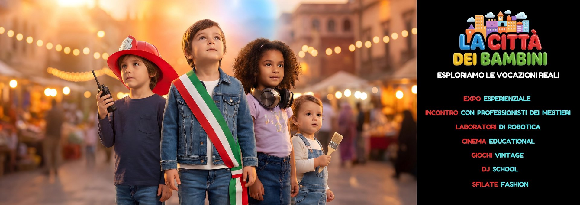 Trasformiamo la galleria in una Micro-Nazione pulsante dove i piccoli non giocano, diventano. Un Expo esperienziale per esplorare vocazioni reali: dai laboratori di robotica alla DJ School, dalle sfilate fashion all'incontro con veri professionisti dei mestieri. Ogni attività completata arricchisce il Passaporto del Cittadino, un diario di viaggio tra cinema educational, conferenze e la magia dei giochi vintage. Insegniamo anche il valore del cuore con la beneficenza. Un villaggio vivo, vibrante, che forma i cittadini e i sogni di domani.